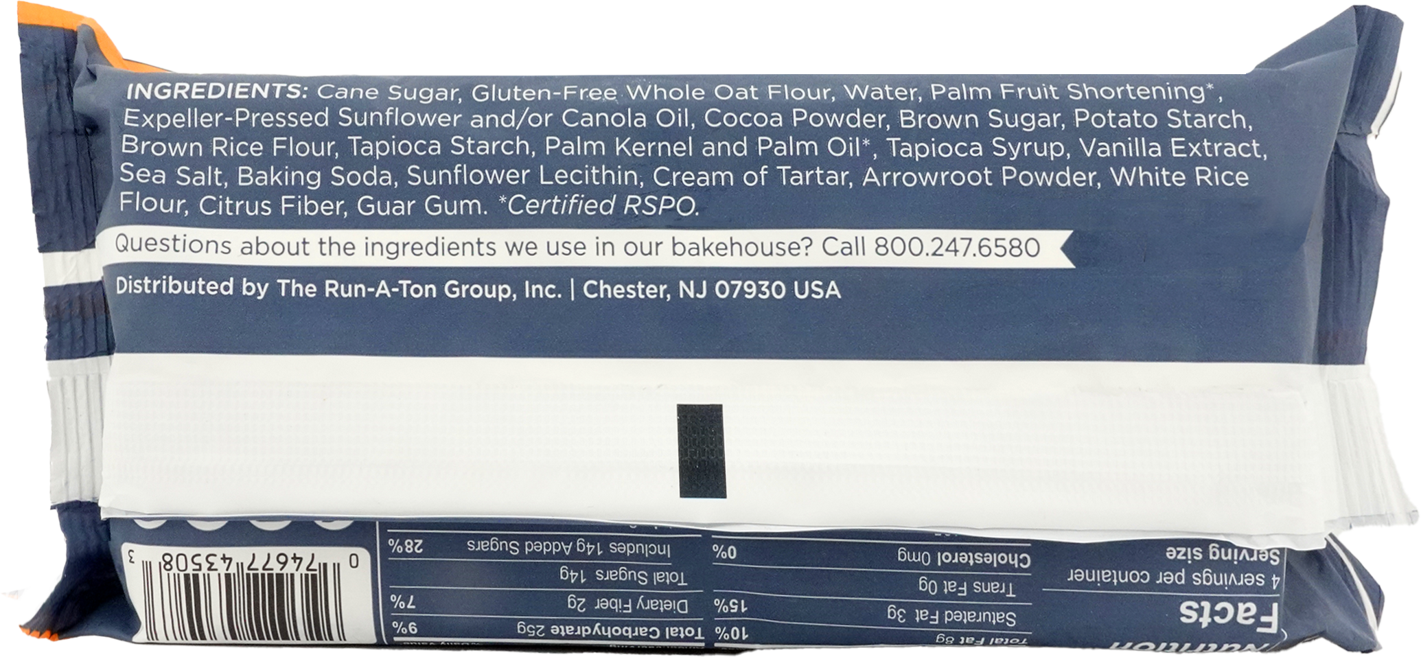 Organic Cane Sugar, Gluten-Free Whole Oat Flour, Water, Palm Fruit Shortening, Expeller-Pressed Sunflower and/or Canola Oil, Cocoa Powder, Brown Sugar, Potato Starch, Brown Rice Flour, Tapioca Starch, Palm Kernel and Palm Oil, Tapioca Syrup, Vanilla Extract, Sea Salt, Baking Soda, Sunflower Lecithin, Cream of Tartar, Arrowroot Powder, White Rice Flour, Citrus Fiber, Guar Gum.